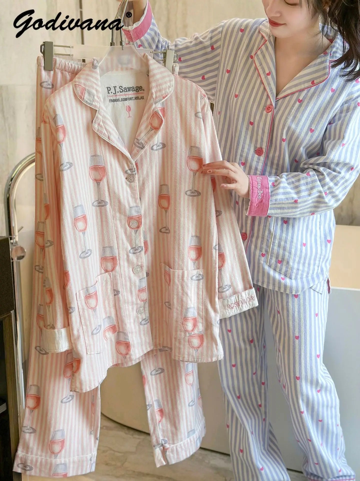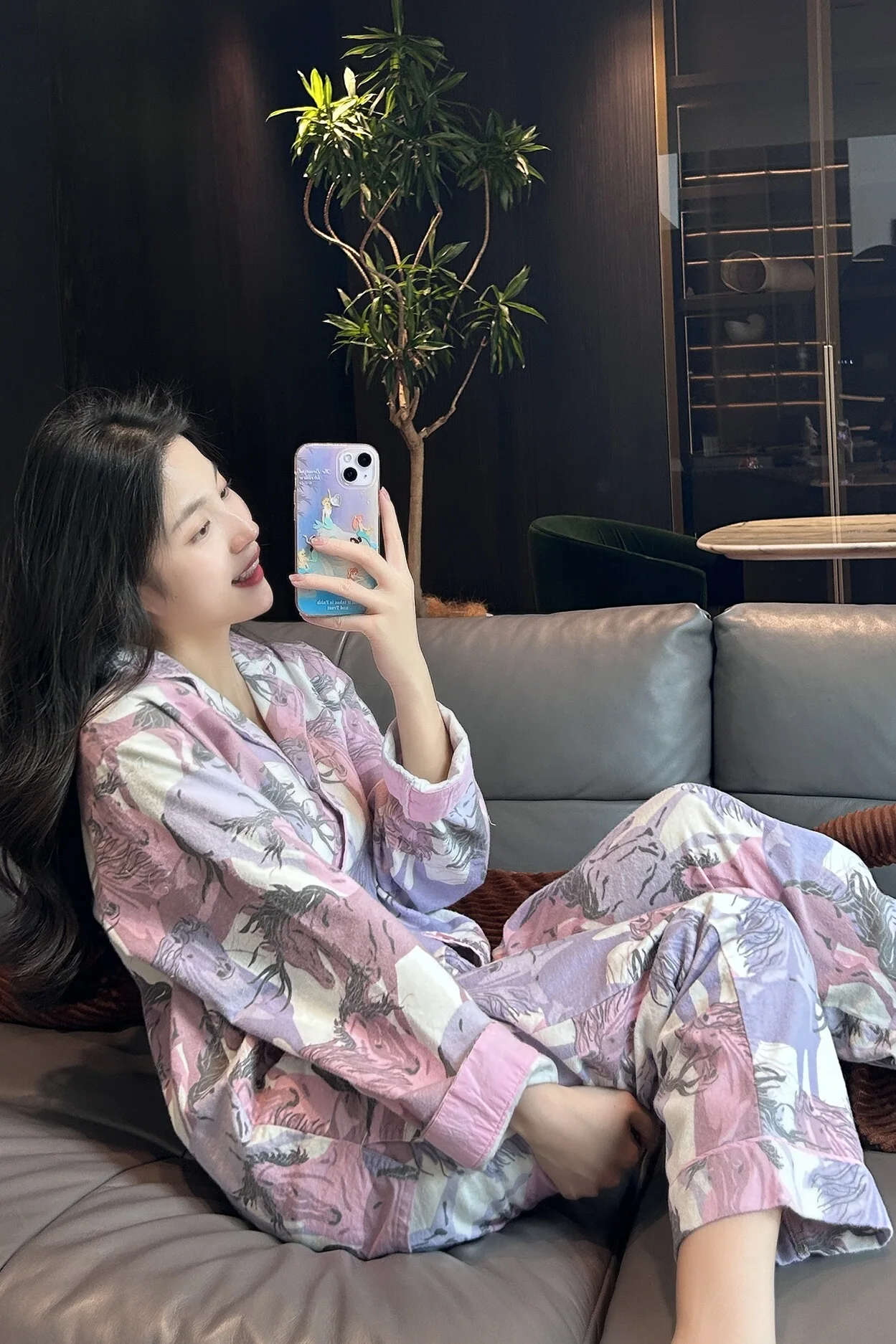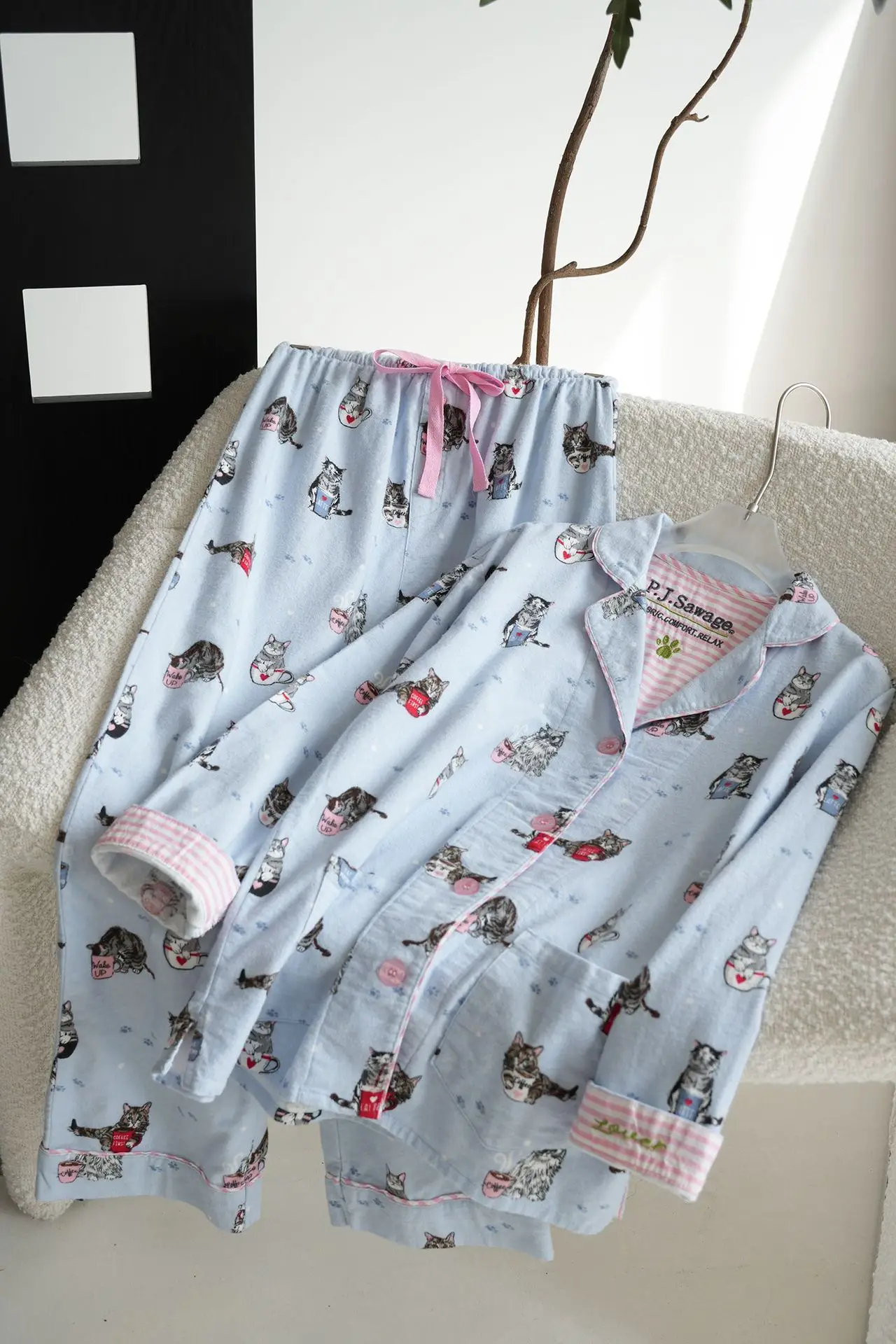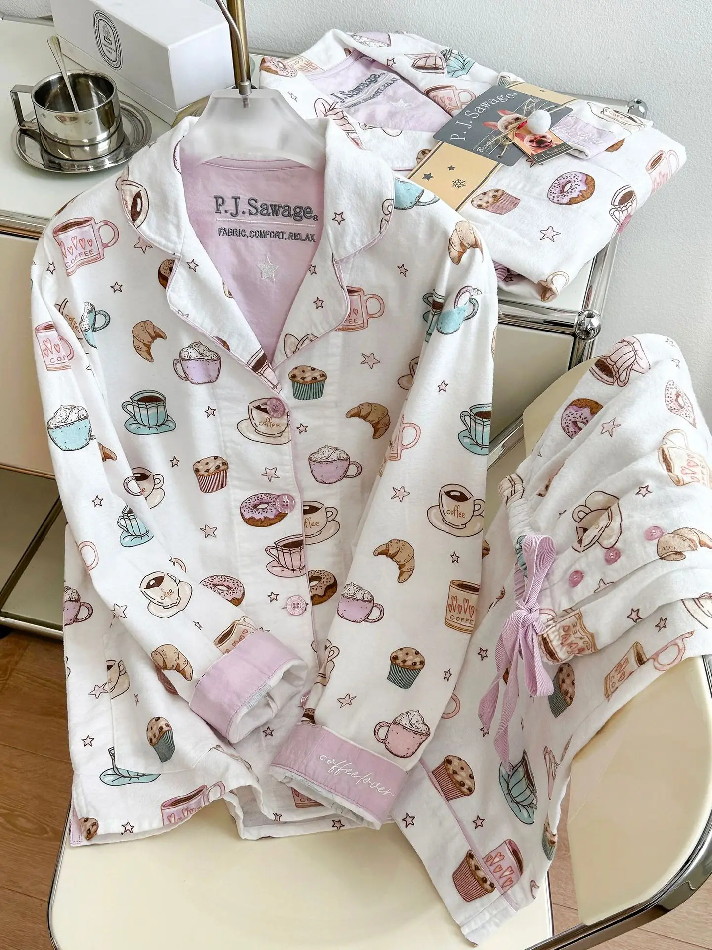 Japanese 100% Cotton Cute Cartoon Printed Pajamas Women's Spring Autumn and Winter Comfortable Loungewear Set Casual Sleepwear
