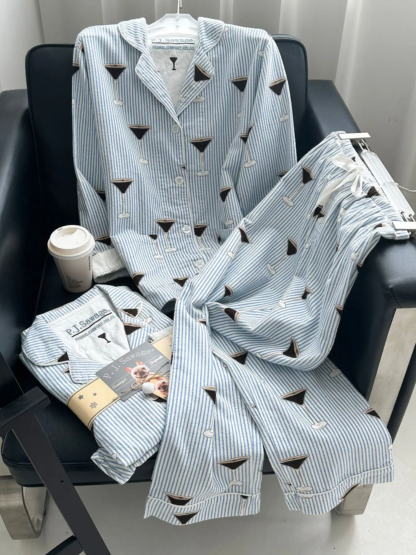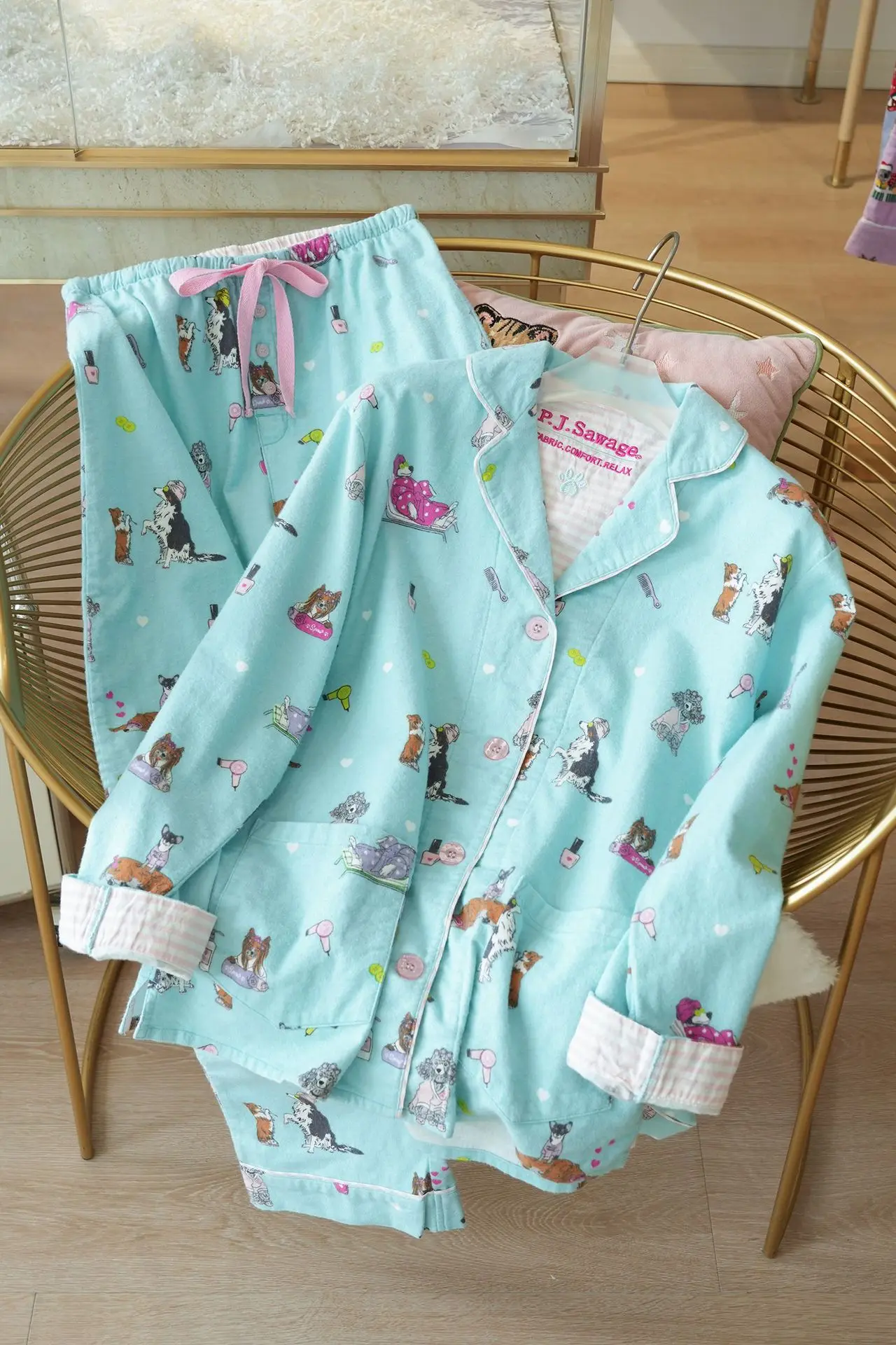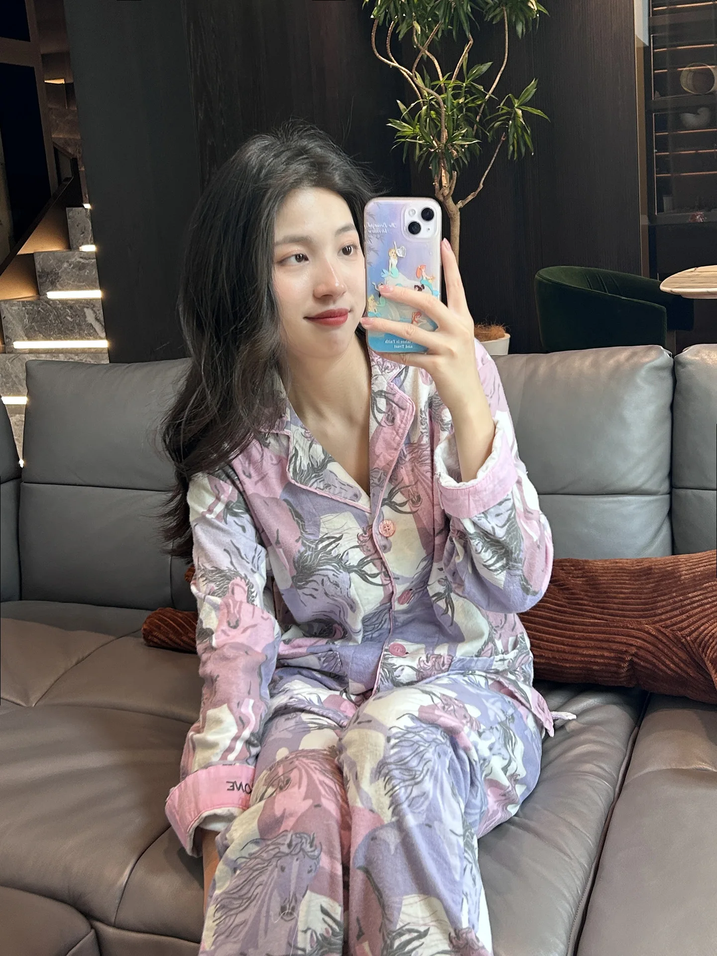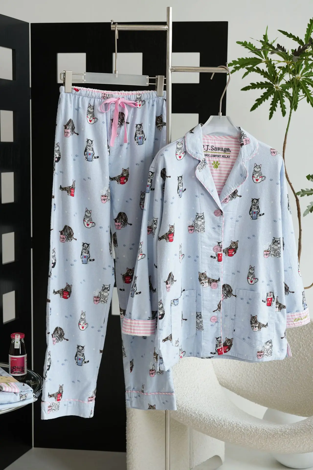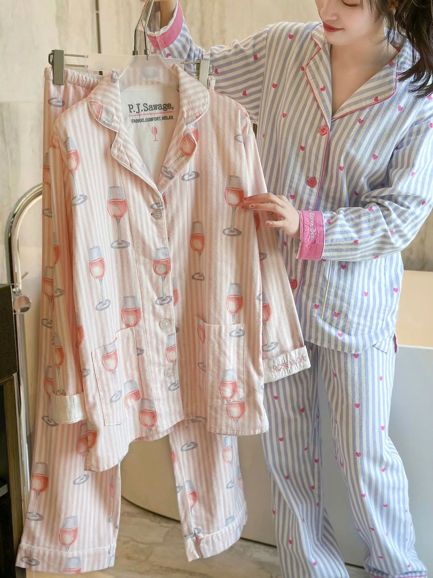 Japanese 100% Cotton Cute Cartoon Printed Pajamas Women's Spring Autumn and Winter Comfortable Loungewear Set Casual Sleepwear